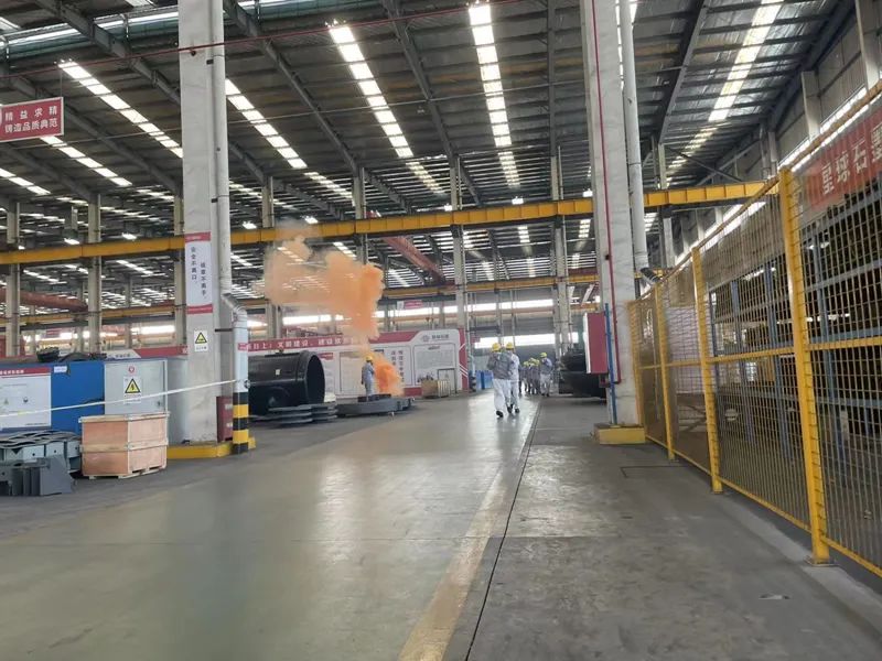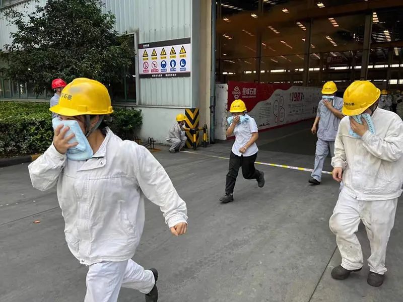总指挥接到报告后立即启动应急预案,车间人员在听到警报后,用湿毛巾捂住口鼻,迅速从安全通道有序撤离到指定地点集合。